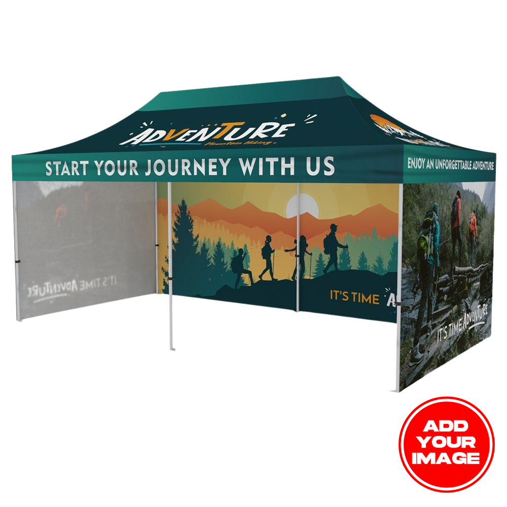Our 10 ft. x 20 ft. Canopy is a practical shade solution for outdoor events, trade shows, and brand activations. With its wide coverage and adjustable telescopic legs, it’s built for a quick, straightforward setup. The complete package includes a custom dye-sublimated canopy top with sharp, eye-catching graphics, paired with premium aluminum hex hardware. It comes with a standard carry bag for transport and storage, with an option to upgrade to a heavy-duty wheeled carry bag for added convenience.