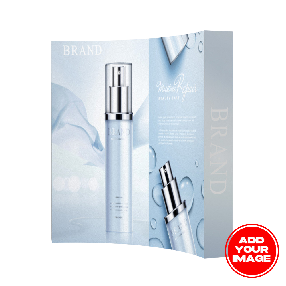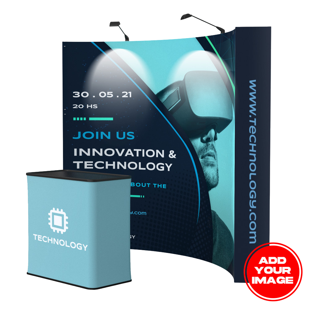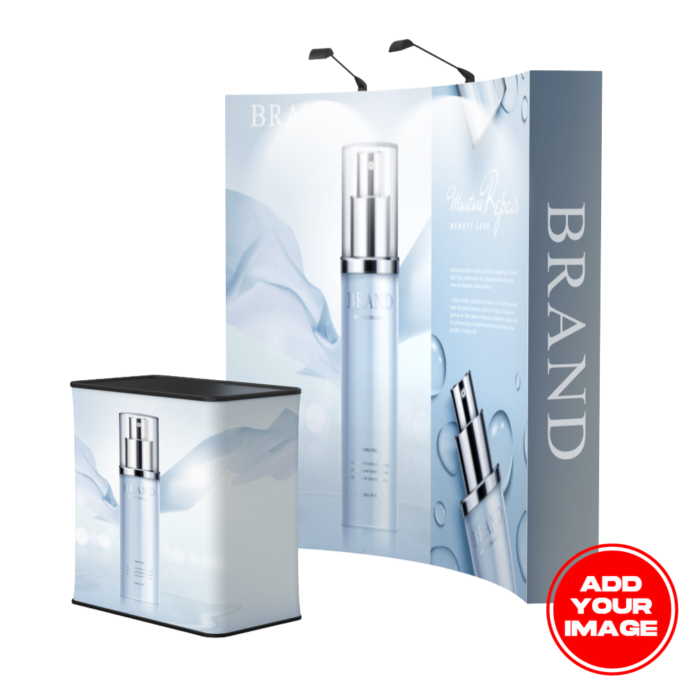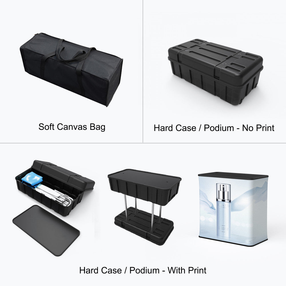 Its concave curved shape helps draw attention toward your booth, and the graphic wraps onto the sides to create full-coverage printed end caps. It also comes with a complimentary soft canvas carry bag, with optional upgrades like a hard case/podium.