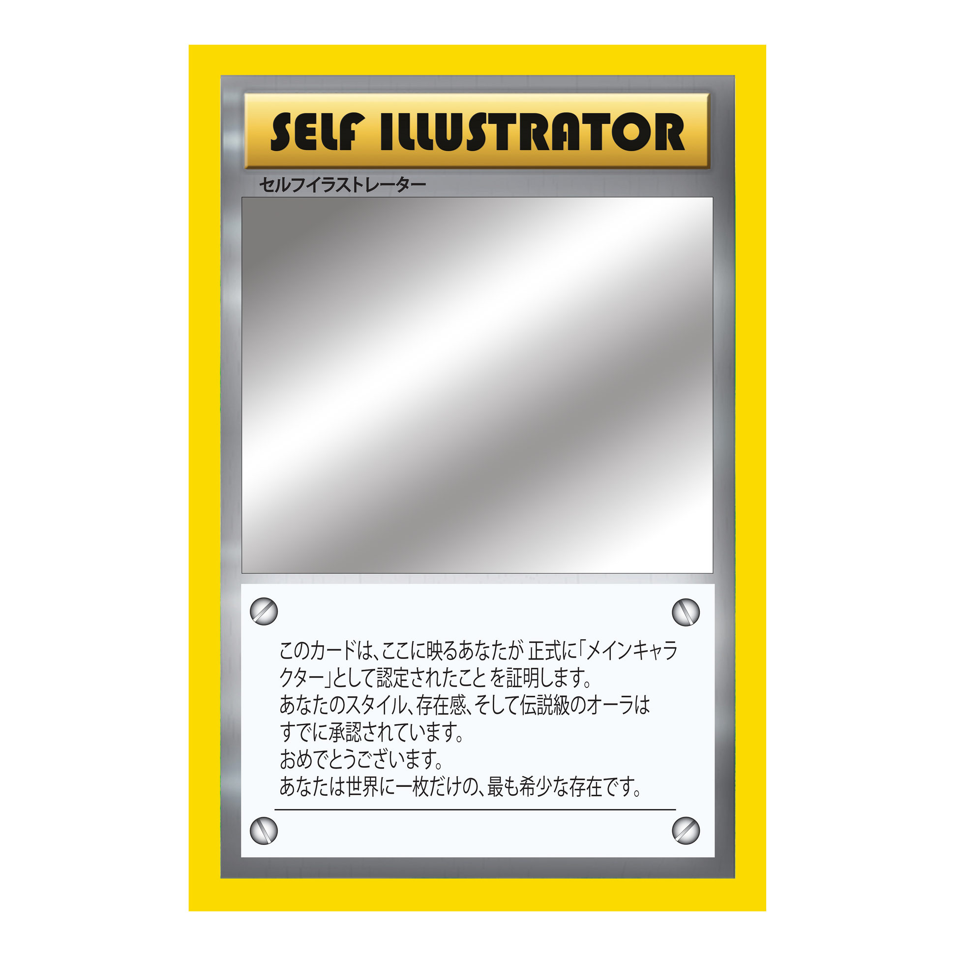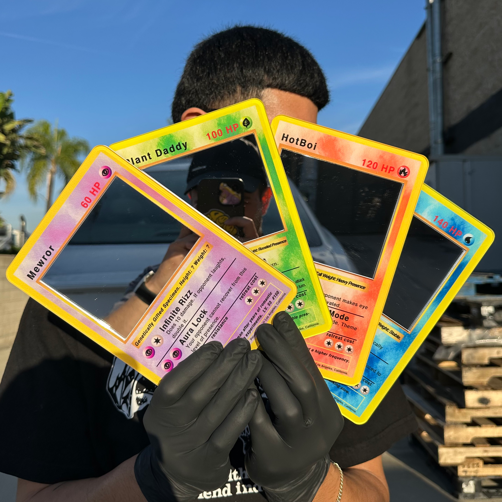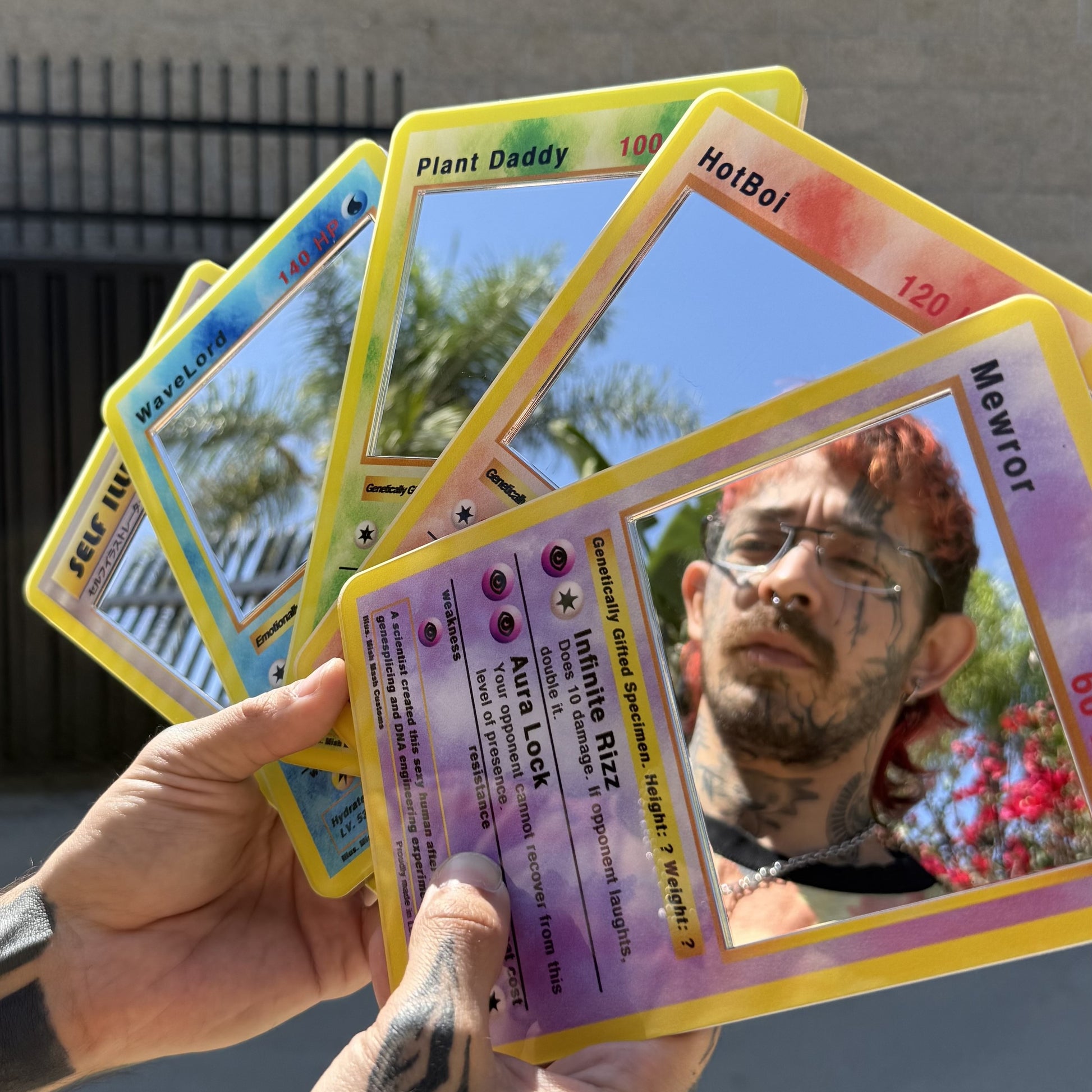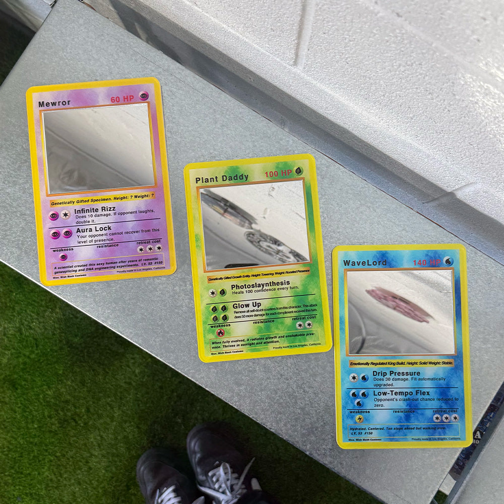 Each mirror recreates the classic trading card layout but replaces the center artwork with a real mirror, so the reflection becomes the "character".